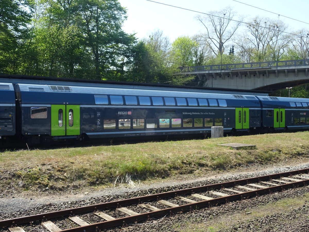 Flensburg Hbf 9.5.2016. Eingestellt in den RE7 nach Hamburg, der aus 5 Wagen besteht der brandneue D-DB 50 80 26 -81 393-3 DBpza 783.0 mit 2 weiteren diese Typs in dem für dieses Netz neuen Außendesign. Steuerwagen und ein weiterer waren noch im bekannten Rot gehalten.
