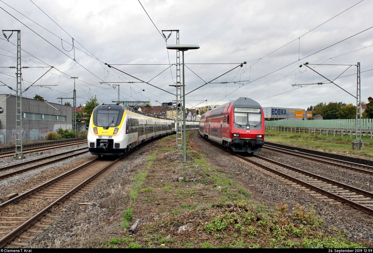 8442 306 und 8442 803 (Bombardier Talent 2) der Abellio Rail Baden-Württemberg GmbH als RB 19514 (RB17a) von Stuttgart Hbf nach Pforzheim Hbf bzw. RE 19614 (RE17b) nach Heidelberg Hbf und DABpbzfa mit Schublok 111 174-9 von DB Regio Baden-Württemberg als verspäteter RE 1???? von Würzburg Hbf nach Stuttgart Hbf begegnen sich bei der Durchfahrt des Bahnhofs Stuttgart-Zuffenhausen.