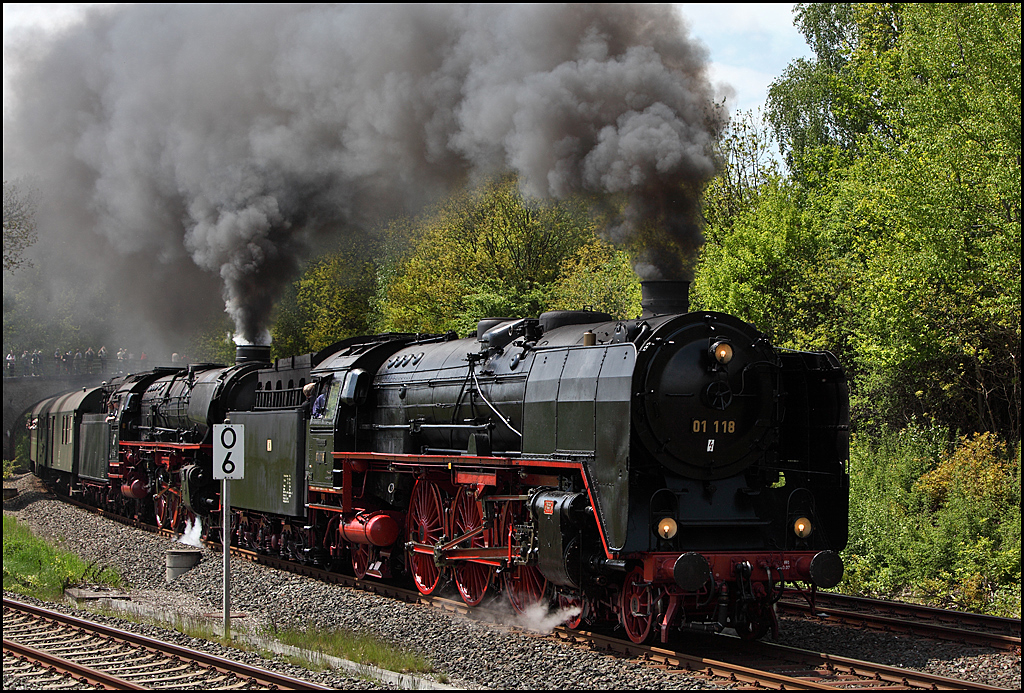 01 118 und 01 1066 haben eine Pendelzug nach Marktschorgast gebracht und rollten nun die Steigung hinab und werden gleich Neuenmarkt-Wirsberg erreichen. (22.05.2010) Florian Böttcher
