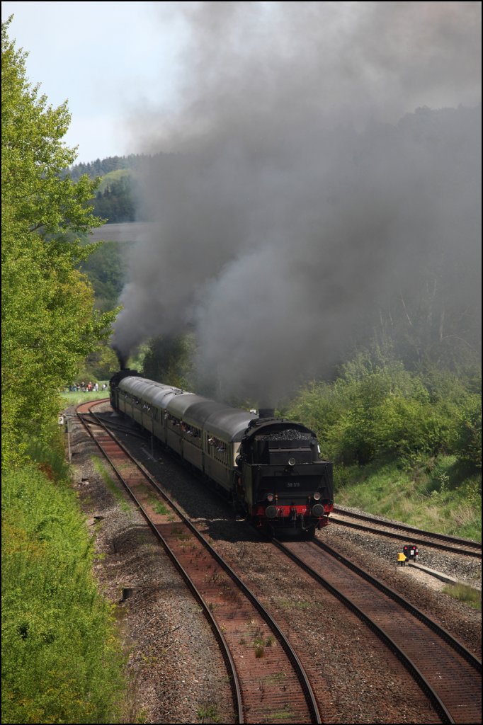 Nachdem die Fotostelle am Km 79,2 erklimmt wurde konnten 38 1301 und 64 491 auf dem Weg nach Marktschorgast abgelichtet werden. (23.05.2010) Florian Böttcher