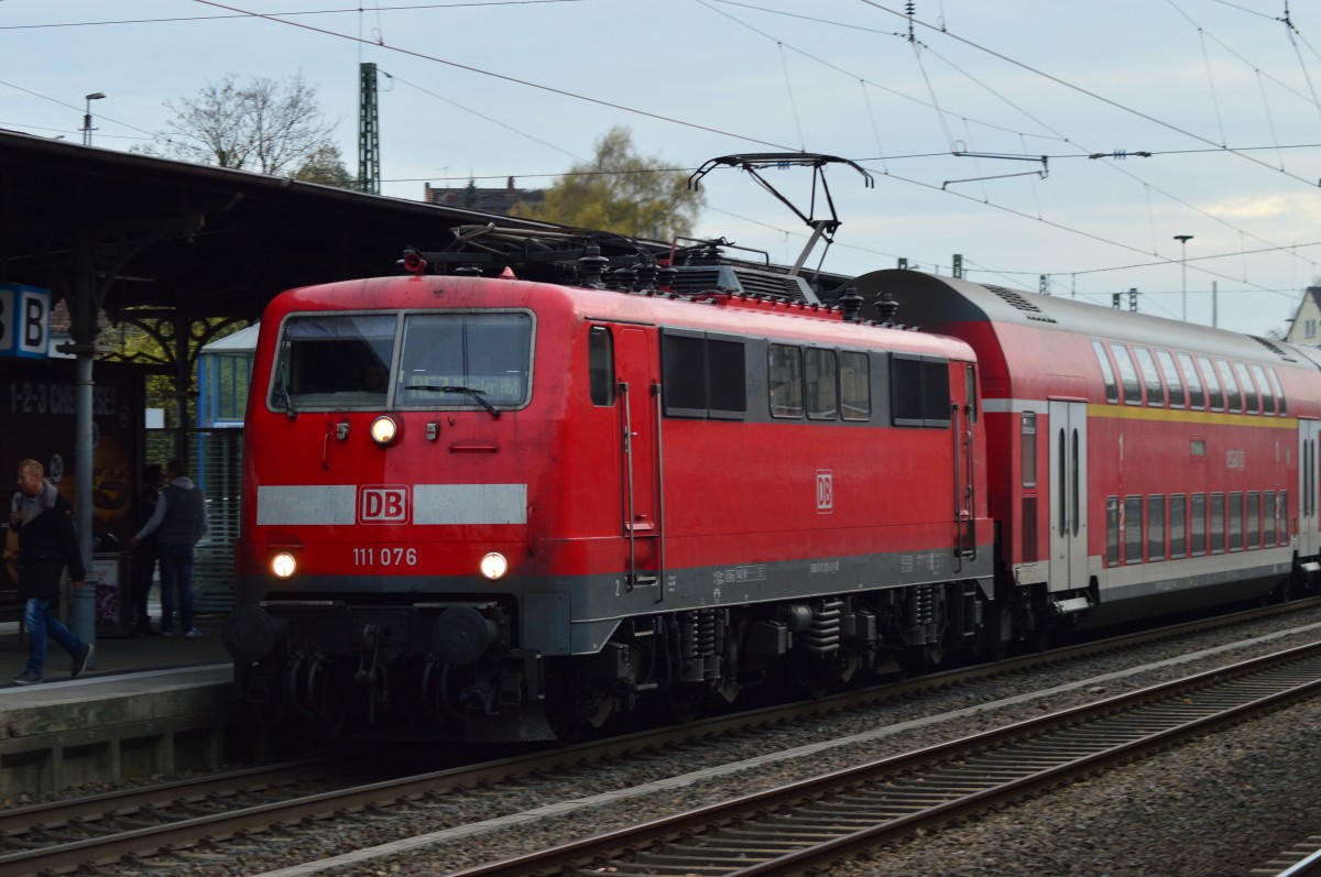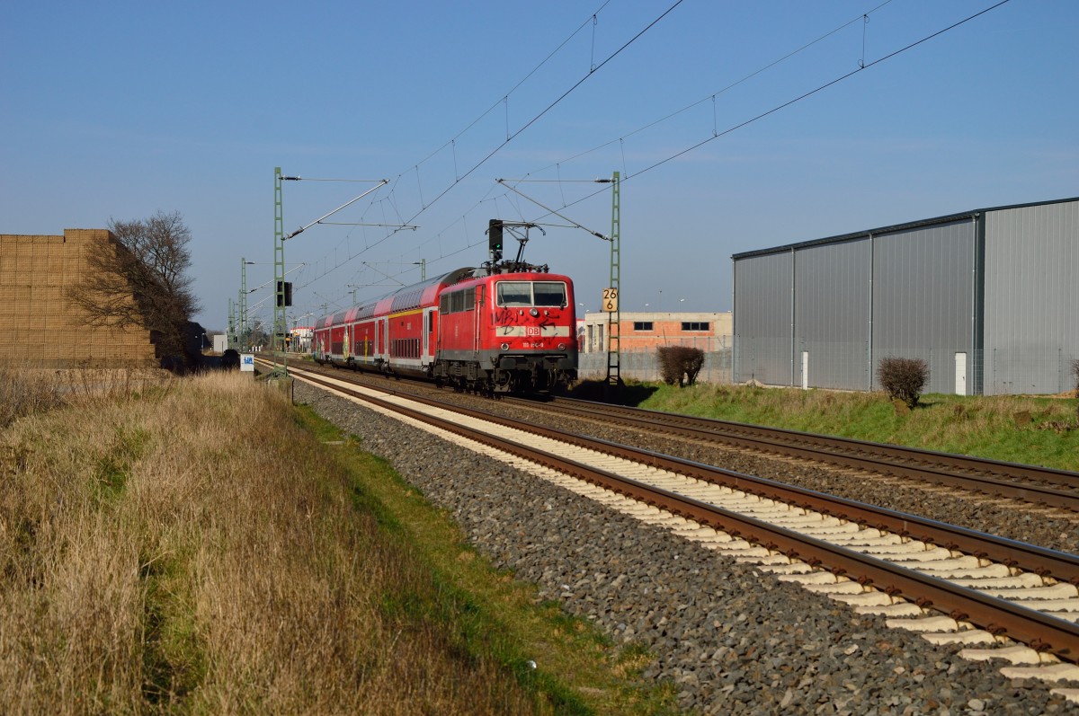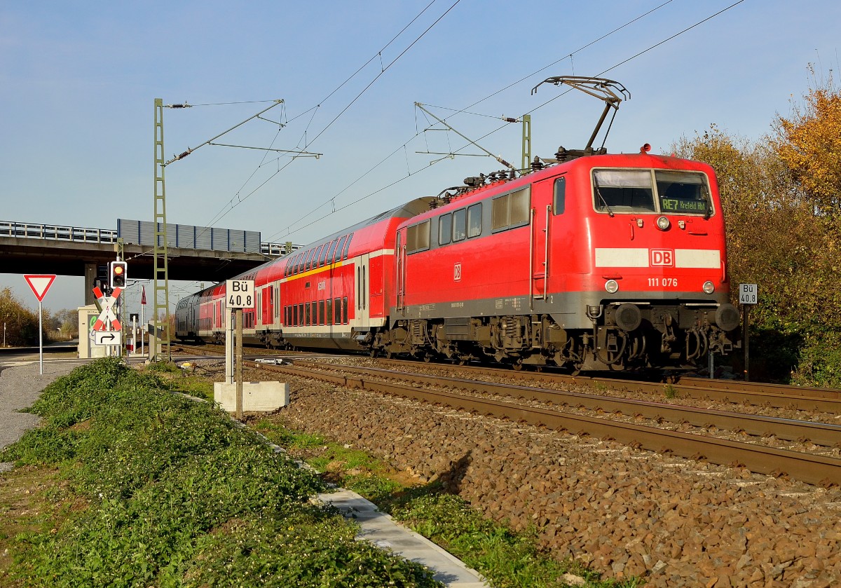 111 076 ist am Sonntagnachmittag den 4.1.2015 mit einem RE7 nach Krefeld unterwegs, hier ist der Zug nahe Neuss-Allerheiligen zu sehen. Andreas Strobel