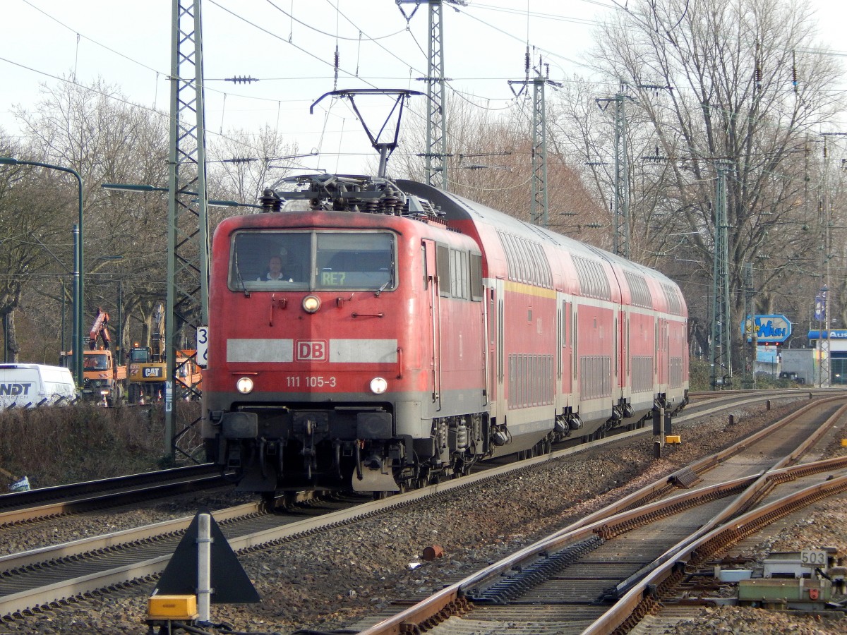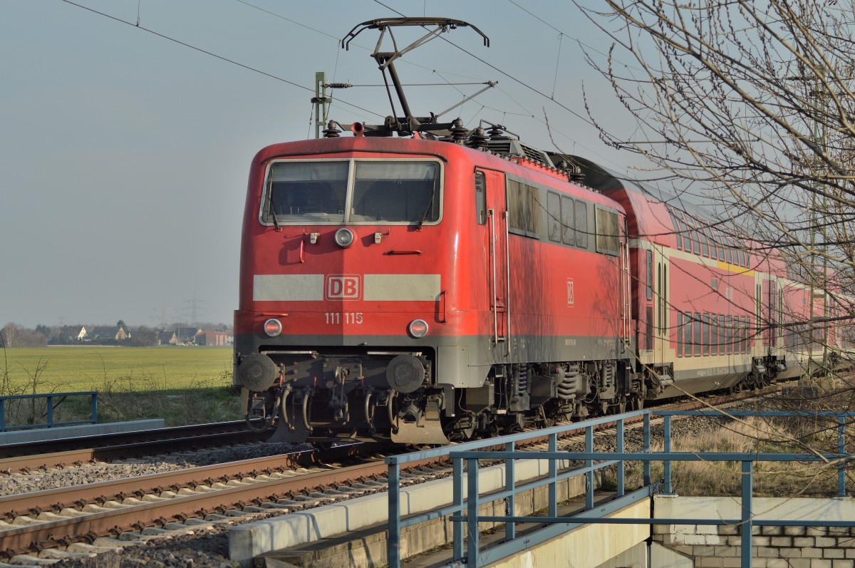 Nachschuß auf die schiebende 111 115 die einen RE7 an der K33 Brücke bei Allerheiligen am Fotografen vorbei gen Köln schiebt. Dienstag den 17.3.2015 Andreas Strobel