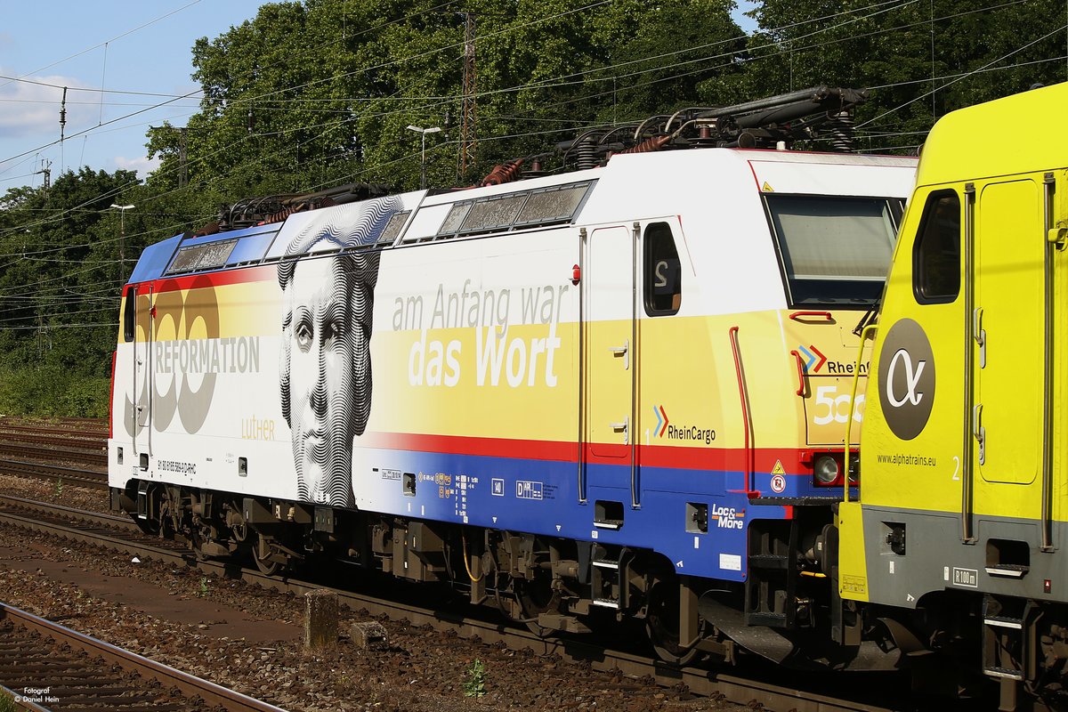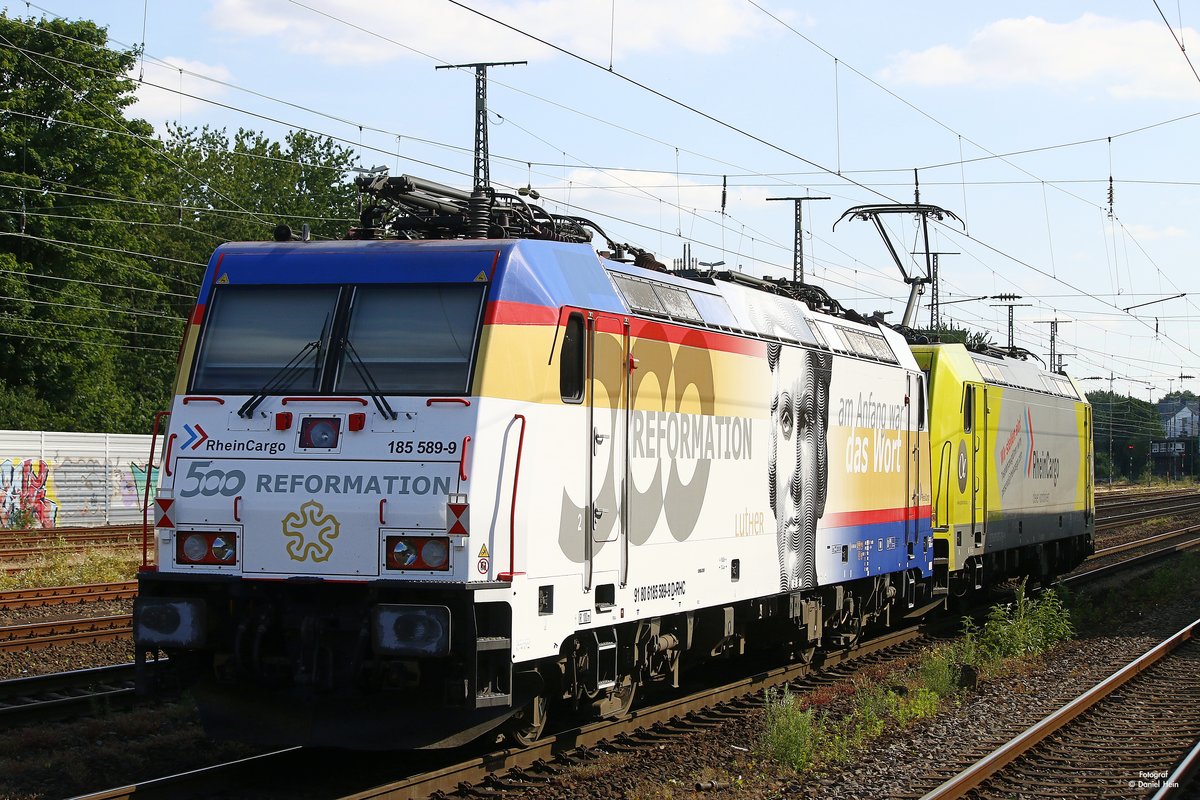 Anläßlich des 500-jährigen Reformationsjubiläums versah die RheinCargo die 185 589-9 mit einem neuen Design. Am 13.07.2017 durchfährt die Lok mit einem Tankkesselzug den Bahnhof Geislingen (Steige) Horst Lüdicke