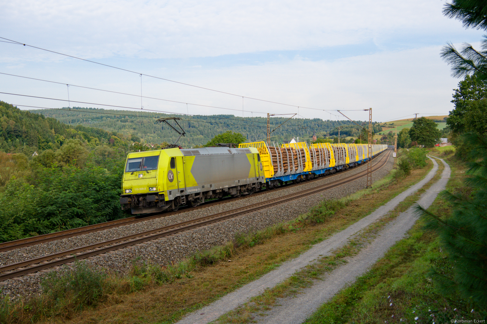 119 009 ATLU/HGB mit einem Innofreight Vollholzzug bei Obersinn Richtung Gemünden, 22.09.2021