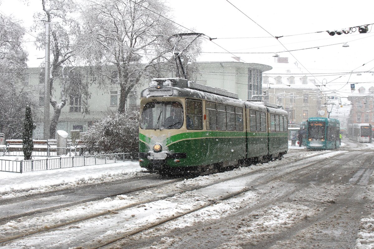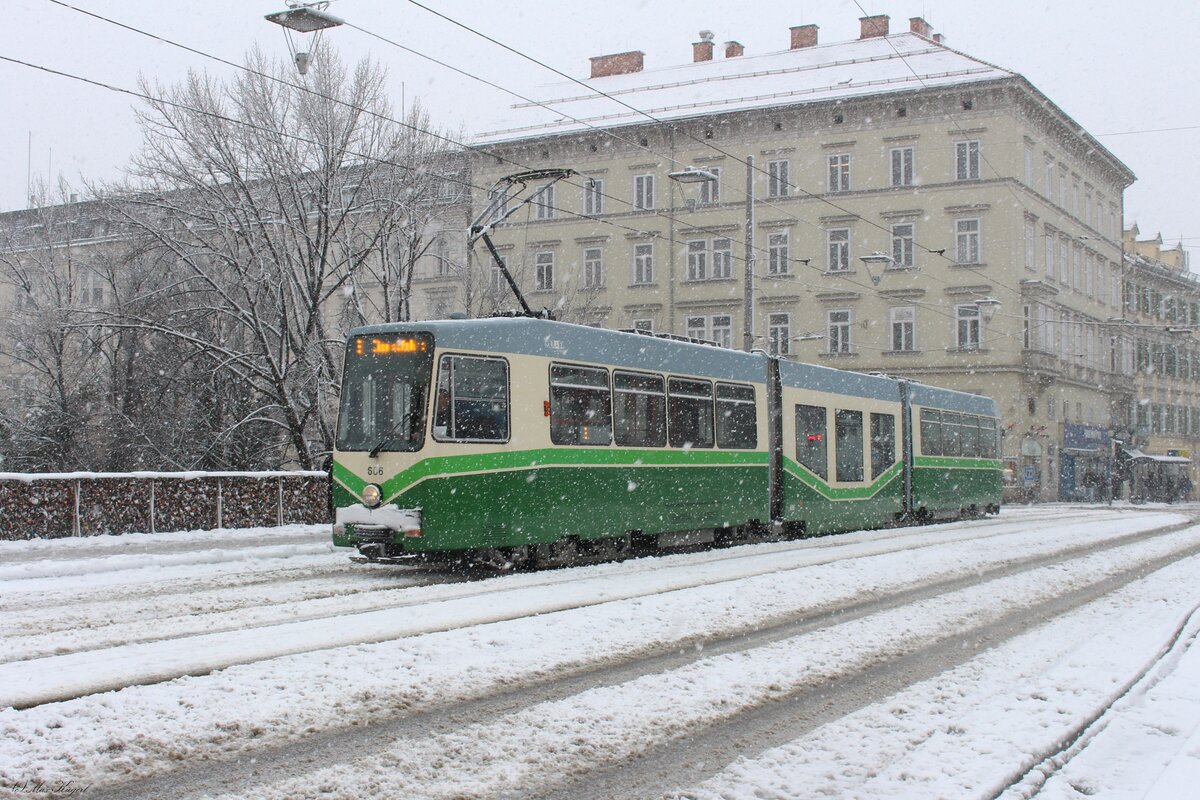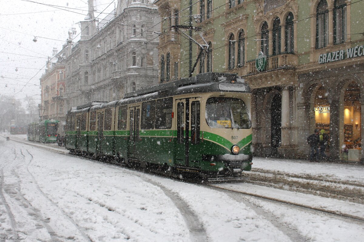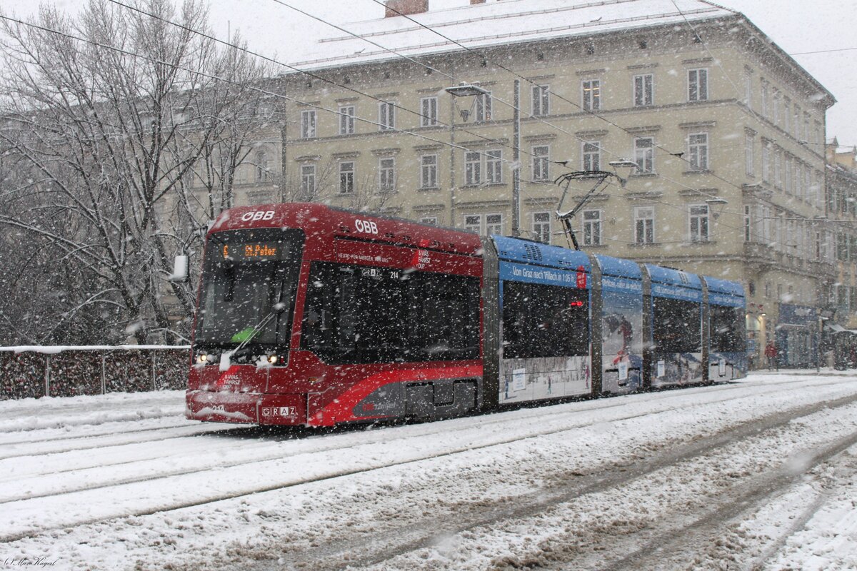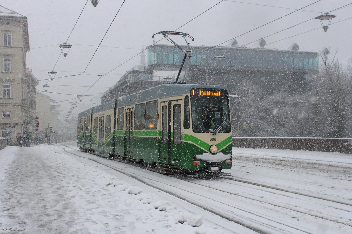 SGP GT8NF Nr. 608 auf der Linie 1 von Eggenberg/LKH nach Mariatrost (eigentlich nur Hilmteich wegen Bauarbeiten) auf der Erzherzog-Johann-Brücke mit dem Kunsthaus im Hintergrund am 20.2.2026. Max Kiegerl