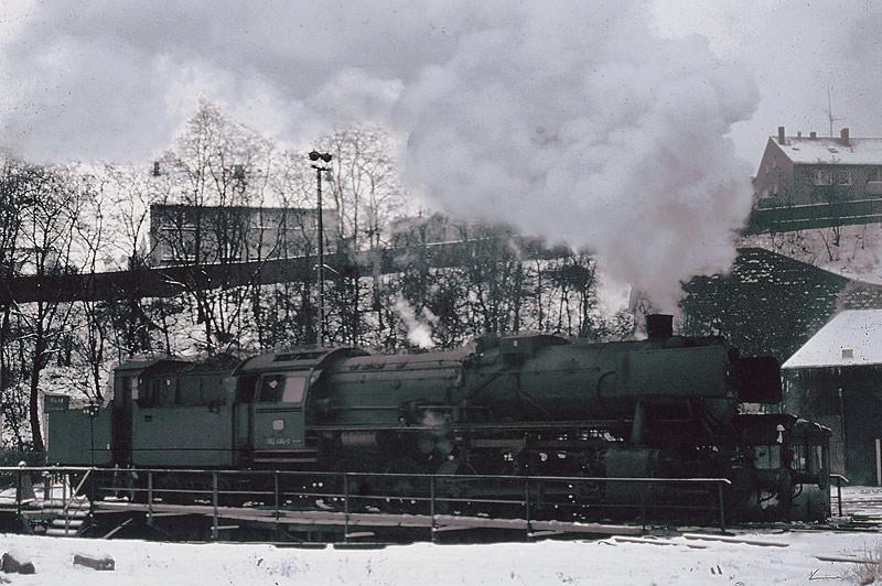Die 050-606 mit Kabinentender vor dem Ringschuppen des