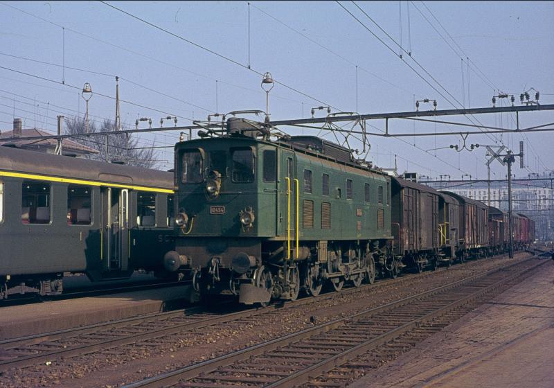 ABDe 4/4 Nr. 165 (damals noch GFM) in Schräglage nach schwerem Unwetter in Münchenwiler/BE, Sept. 1969. Triebwagen wurde mit Seil (rechts sichtbar) gesichert. Scan ab Papierbild (Walter). Sylvia und Walter Stoll
