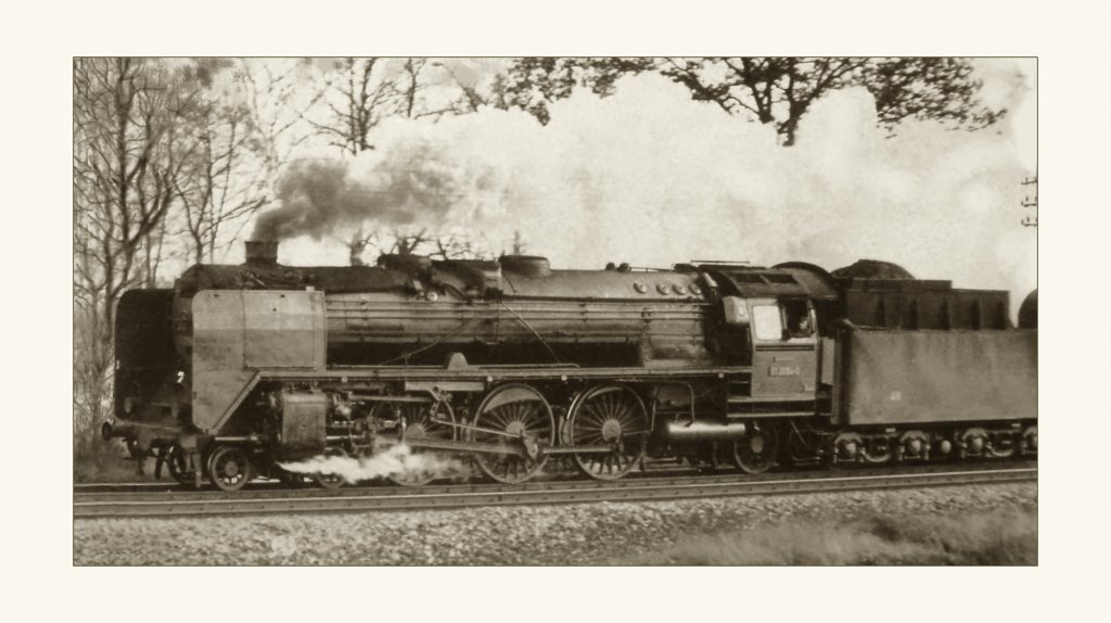 01 2207 mit den großen Ohren (Wagner-Windleitbleche)kurz vor der Ausfahrt mit einem D-Zug nach Chemnitz (damals, Karl-Marx Stadt)