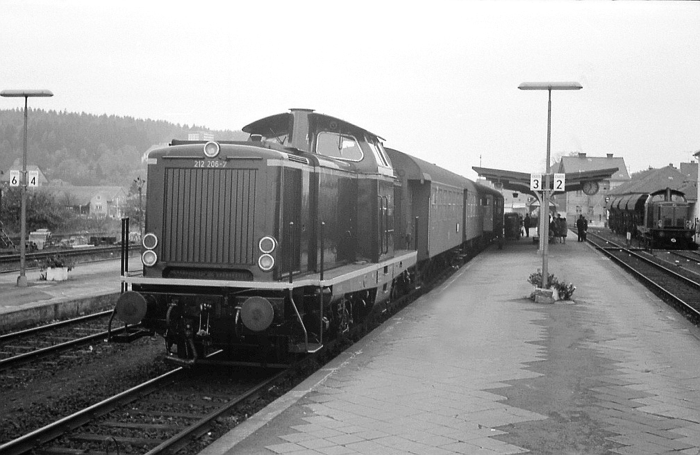 V 100 und Umbaudreiachser - bis in die 1970er Jahre ein vertrautes Bild auf vielen Nebenstrecken (und Modellbahnanlagen !). Die damals beim BW Kassel beheimatete 212 206 wartet im Frühjahr 1974 in Frankenberg auf Kreuzung mit dem "Heckeneilzug" Frankfurt - Bremen. Markus Engel
