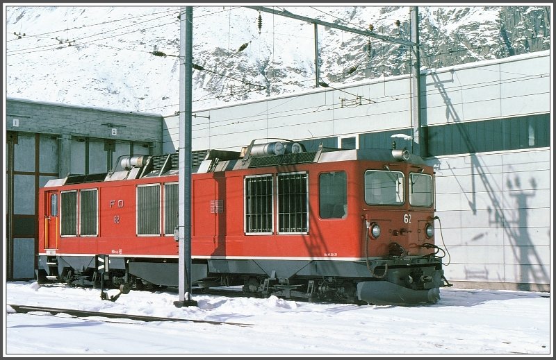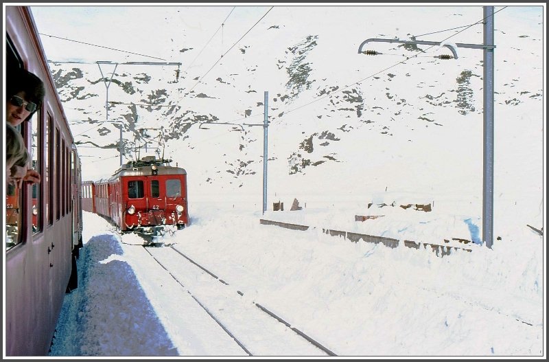 Disentis/Mustér noch ohne Hochperrons und Bansteighalle. Ge 4/4 I 604 "Calanda" noch mit grünem Wagenmaterial bringt Anschlussreisende für den FO Zug mit HGe 4/4 36. Es liegt bereits Schnee am 14.10.1975. Herbert Graf