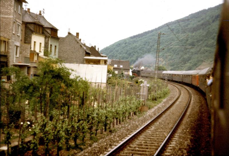 Hier befindet sich anno 1975 die 01 1061 mit ihrem schönen Sonderzug bereits auf der Rückfahrt am Rhein entlang zwischen Koblenz und Köln, mit reichlich Verspätung, trotz Ausfalls der Fotohalte und dem Aufenthalt in Trier. Es war eine pannengeladene Fahrt, aber trotzdem schön. Stefan Kilian