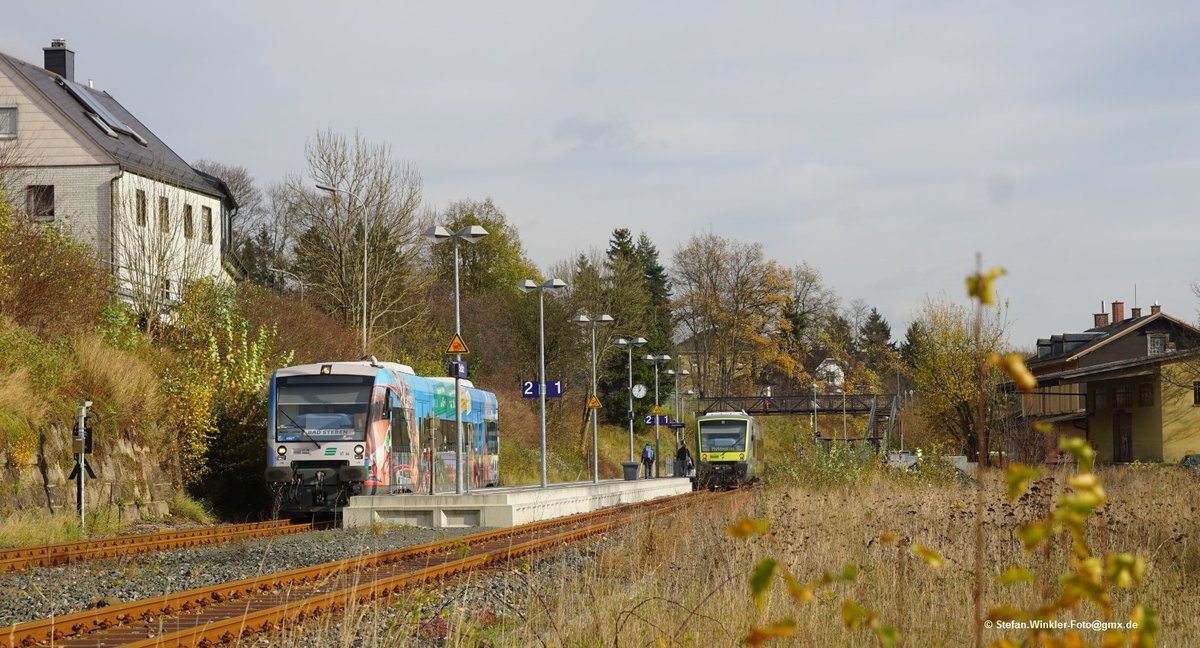 Der Bahnhof Selbitz ist runderneuert, sowas wie ein EG oder einen Güterschuppen braucht man nicht mehr. Beides steht aber noch rum, bis vor wenigen Jahren gab es hier noch einen Fahrdienstleiter, der auch die Zugkreuzung abfertigte. Gekreuzt wird hier immer noch, bis 1976 zweigte auch noch die Strecke nach Schauenstein-Helmbrechts-Münchberg ab (hinter dem EG nach rechts). Hier sieht man einen AG 650 der sich mit dem VBG Leih-VT, der links nach Bad Steben fährt, getroffen hat.