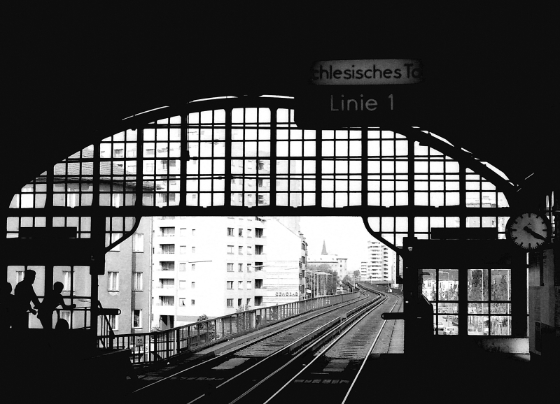 Menschenleerer Geisterbahnhof im Sommer 1979: die U-Bahnstation Gleisdreieck. Damals war nur der obere Bahnsteig der Linie U1 in Betrieb. Scan vom Negativ. ukamp