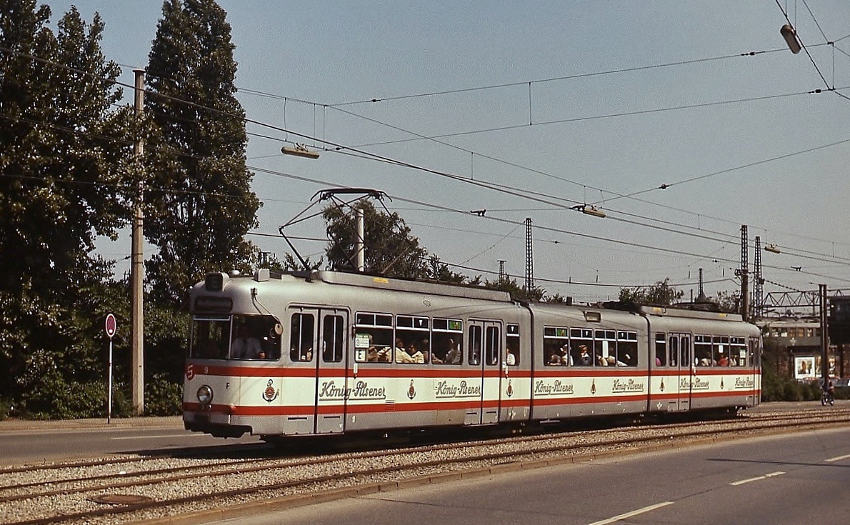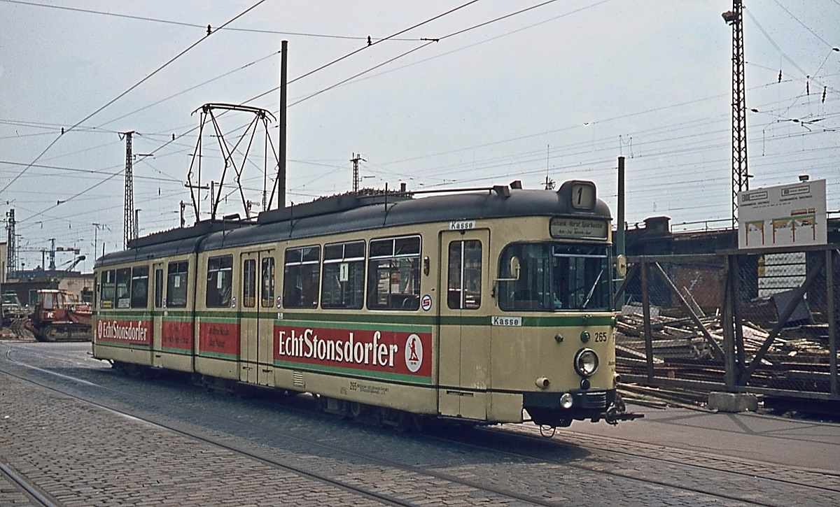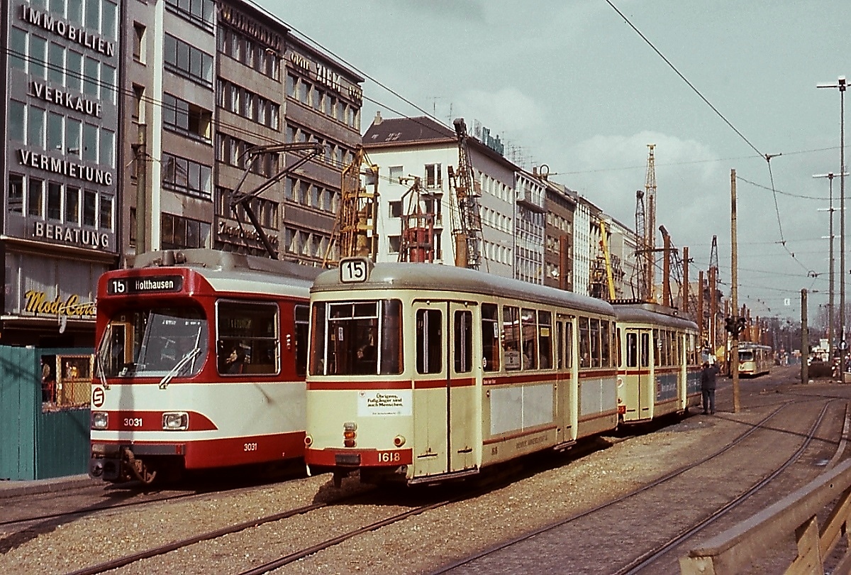 Im Sommer 1979 begegnen sich im Sommer 1979 zwei Rheinbahn-Züge der Linie 15 auf der Heinrich-Heine-Allee, links der fast noch nagelneue GT8S 3031, daneben ein Vierachserzug mit dem Bw 1618 am Schluss. Die Rammen im Hintergrund sind ein sichtbares Zeichen, dass die Arbeiten für den U-Bahn-Bau begonnen haben. Kurz danach wurde das vom GT8S befahrene Gleis stillgelegt und durch eine neue Streckenführung durch die Bolker- und Hunsrückenstraße ersetzt. Horst Lüdicke