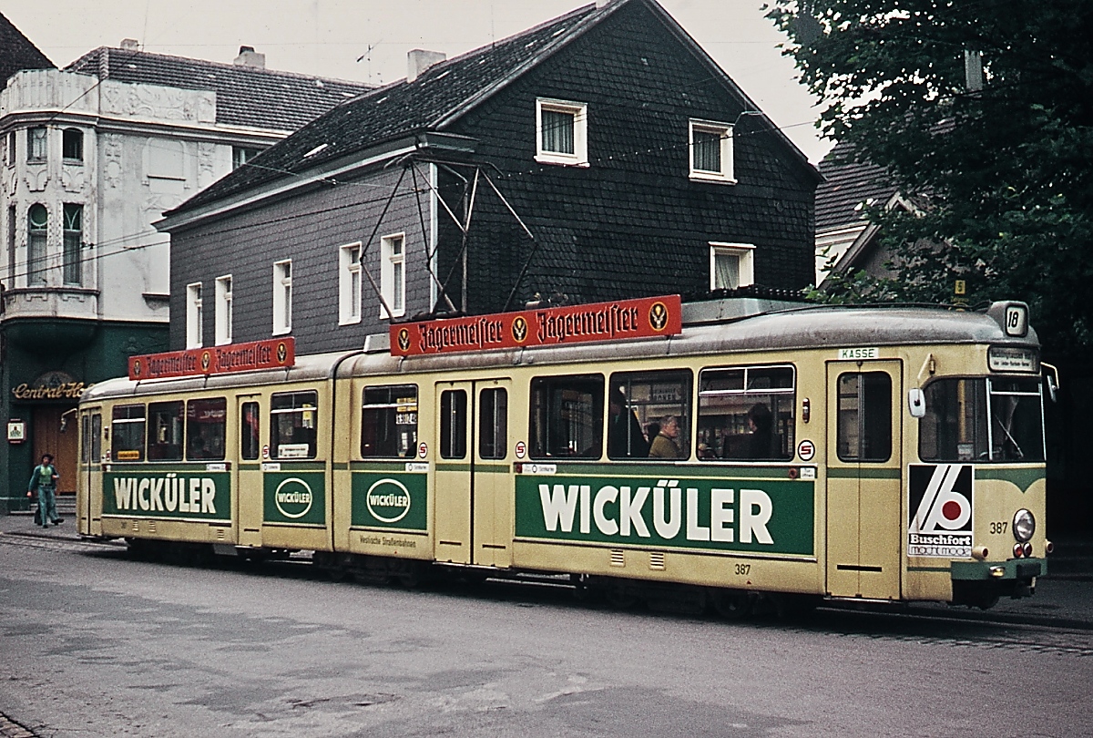 Wie andere Linien wurde auch die Linie 18 von den Vestischen Straßenbahnen und der Bogestra im Gemeinschaftsbetrieb befahren. So konnte es dazu kommen, dass Fahrzeuge der Vestischen Straßenbahnen aus dem nördlichen Ruhrgebiet bis in den tiefsten Süden des Reviers kamen. Hier wartet der GT6ZR 387 im Jahre 1979 an der Endhaltsstelle Bochum-Dahlhausen auf die Rückfahrt nach Recklinghausen Hbf.. Horst Lüdicke