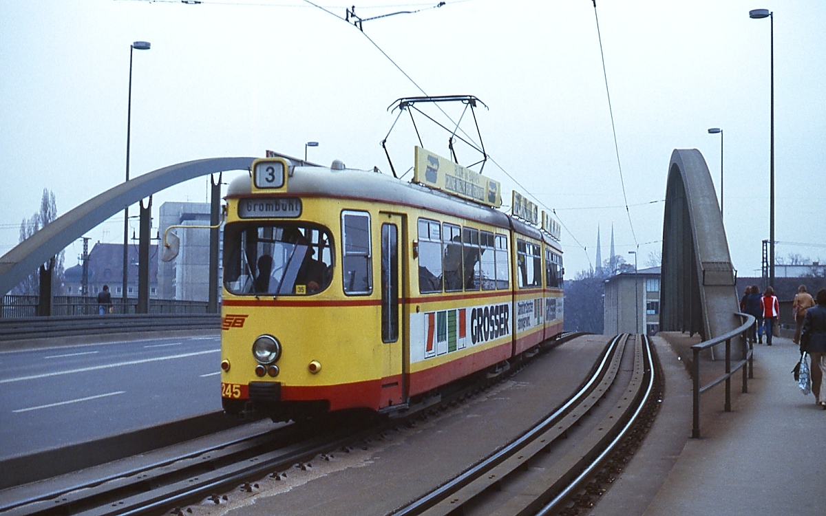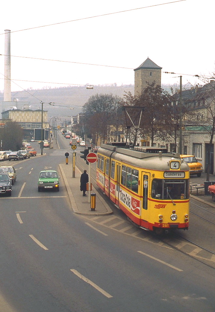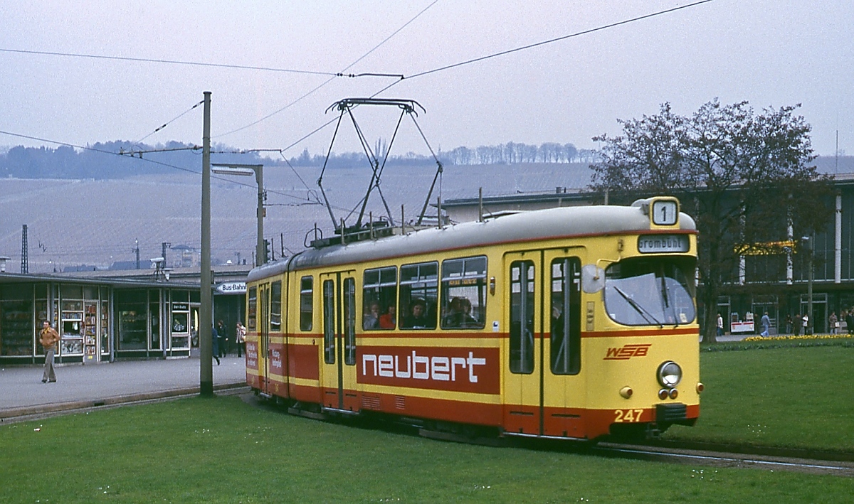 1975 erwarb die Würzburger Straßenbahn zwölf Zweirichtungs-Sechsachser von der Hagener Straßenbahn, die als GT-H 270-281 eingereiht wurden, hier GT-H 274 als Werkfahrt im Frühjahr 1979 Horst Lüdicke