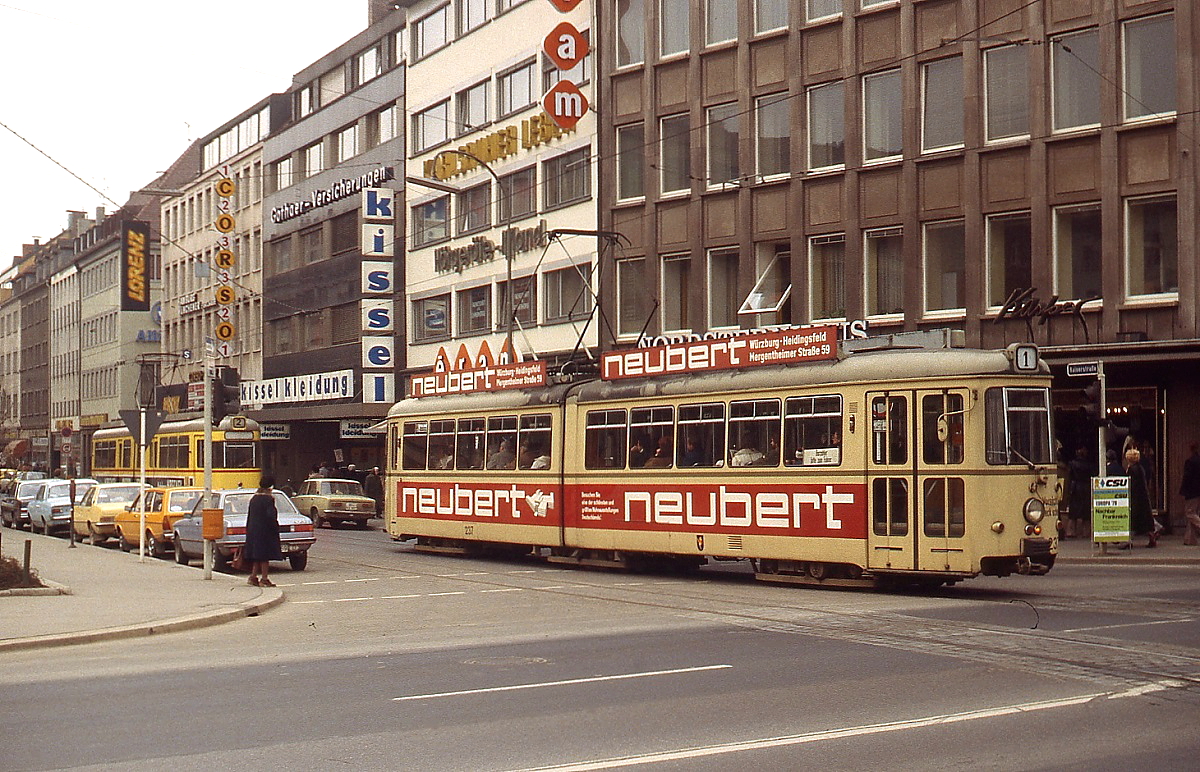 1975 übernahm die Würzburger Straßenbahn 12 Zweirichtungstriebwagen der Hagener Straßenbahn, hier der GT-H 272 ("H" für Hagen, dort 72) im Frühjahr 1979 auf der Kaiserstraße kurz vor dem Hauptbahnhof. Das 1962 gebaute Fahrzeug blieb als Museumstriebwagen erhalten. Horst Lüdicke