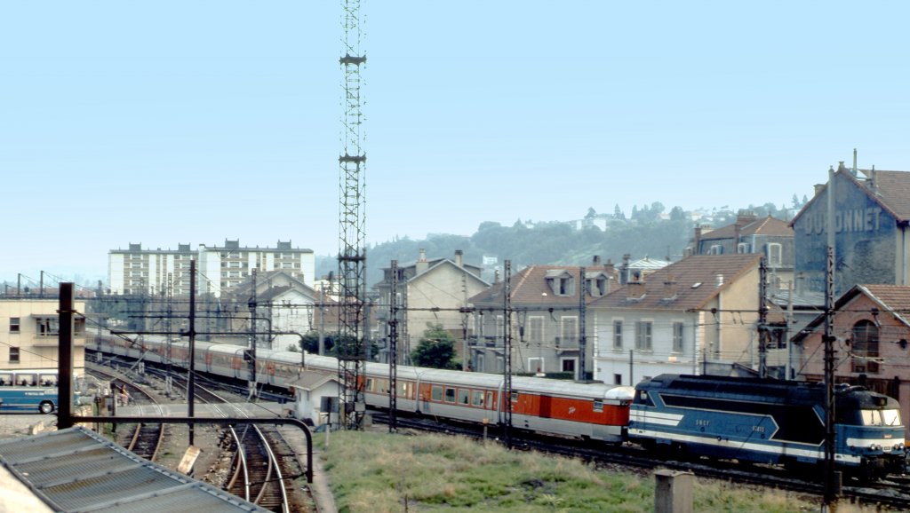 Frankreich, Rhône-Alpes, Savoie, Aix-les-Bains. Die BB 67413 mit dem Tee (1969-1982) Catalan-Talgo Barcelona-Genf bei der Ausfahrt aus dem Bahnhof von Aix-les-Bains in Richtung Culoz, Scan eines Dias aus dem Jahr 1975 Jean-Claude Delagardelle