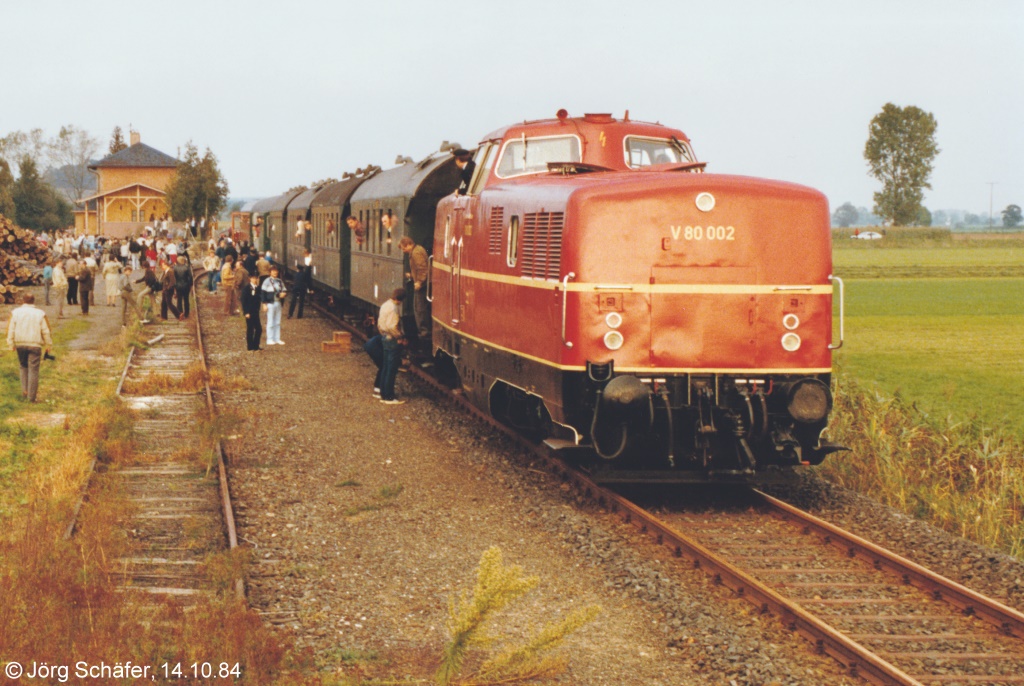 Blick nach Osten auf V 80 002 im Bahnhof Steppach-Pommersfelden am 14.10.1984. Die mitfahrenden Eisenbahnfans begutachten beim Fotohalt die historische Zuggarnitur. Jörg Schäfer