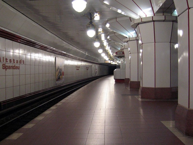 U-Bahnhof Altstadt Spandau: Von Rümmler 1984 gestalteter Bahnhof,der mit seinen rot weissen Farben an das Wappen Brandenburgs erinnert. Die Station präsentiert sich als dreischiffige Halle mit einer Doppelstützenreihe. Planungsname war Havelstrasse. C-R