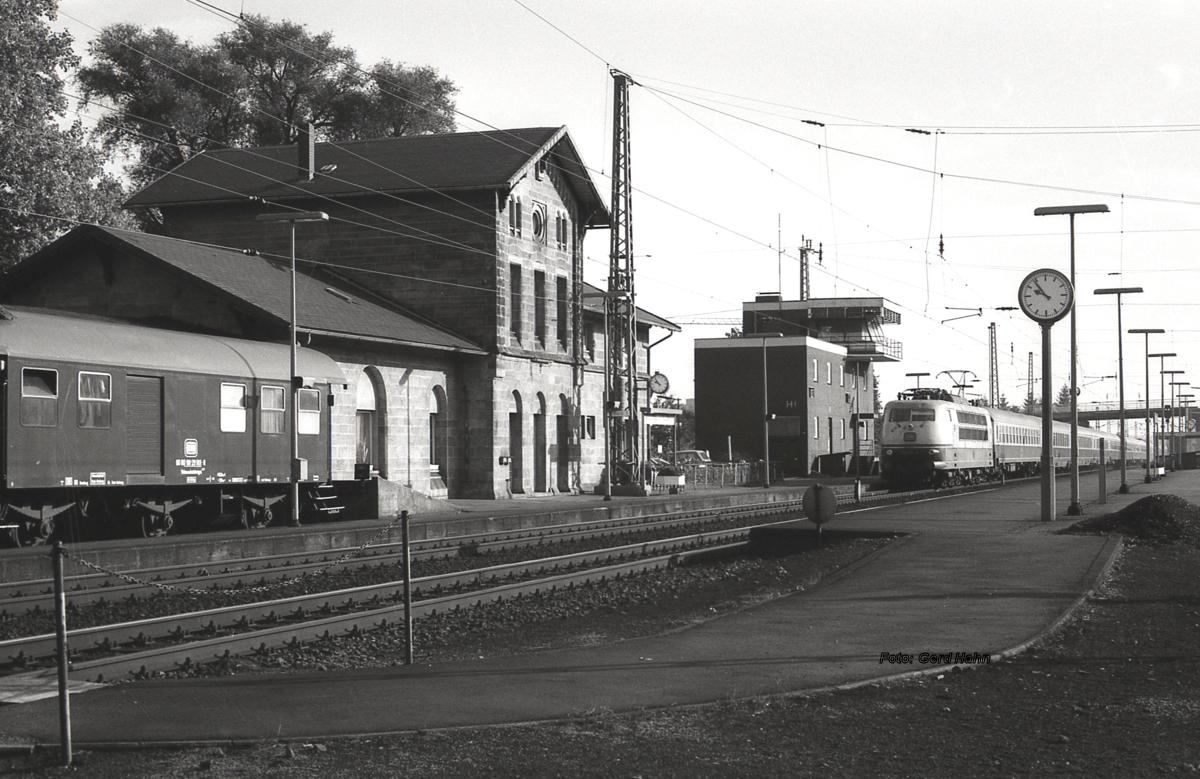 Gerade braust ein Intercity mit 103212 heran. Die Uhr zeigt 9.54Uhr und der Zug ist in Richtung Münster unterwegs. Damals gab es auch noch ein Abstellgleis vor dem alten Güterschuppen, welche beide später weichen mussten. Gerd Hahn