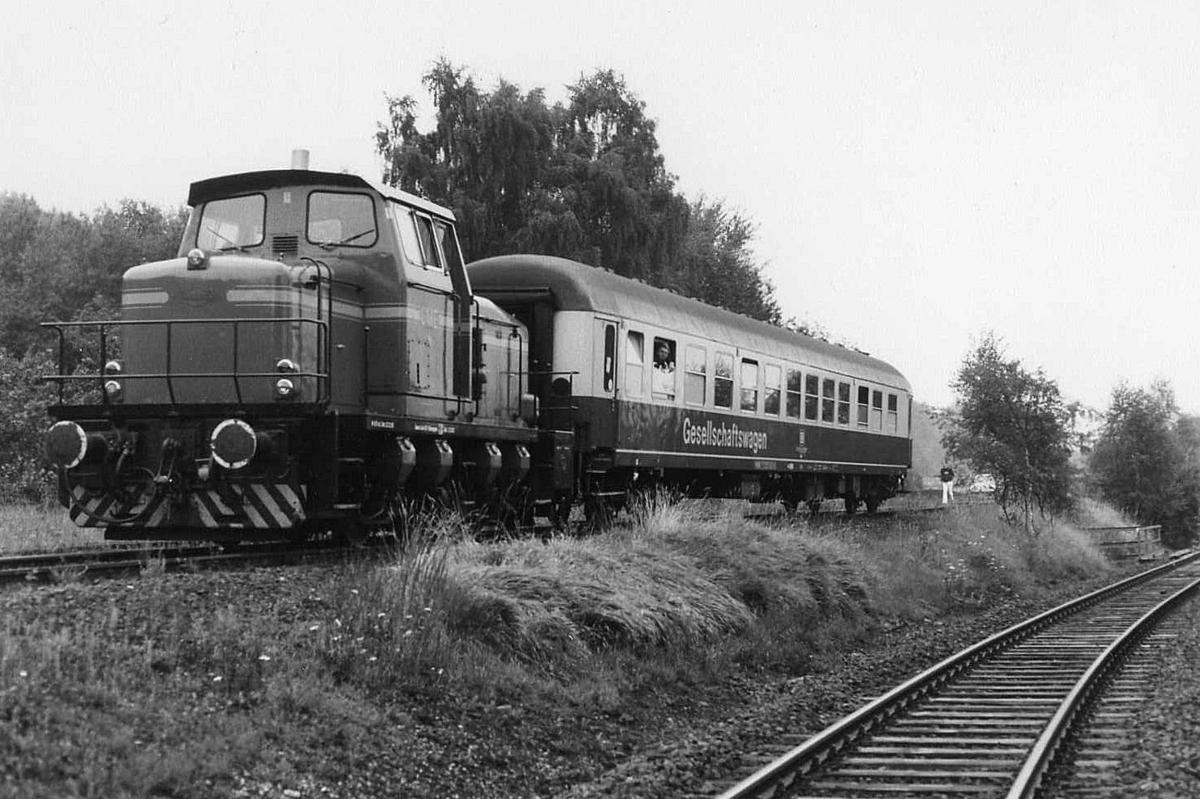 Ein Sonderzug auf der alten Hüggelbahn am 3.9.1985. Anlässlich einer Buch Vorstellung hatte Lok GME 4 einen Gesellschaftswagen am Haken, mit dem sie in Hasbergen - Ohrbeck noch einmal ein kurzes Stück der damals noch vorhandenen Hüggelbahn befuhr. Daneben verläuft etwas tiefer gelegen auch das heute noch genutzte Streckengleis der Werkbahn Hasbergen - Georgsmarienhütte. Die Hüggelbahn, übrigens die erste private Eisenbahn in Deutschland, wurde inzwischen vollständig abgebaut. Gerd Hahn