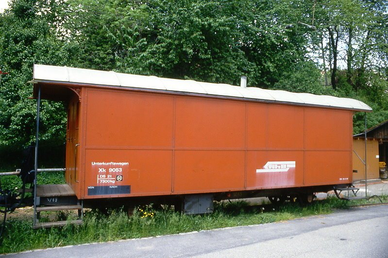 RhB - Xk 9053 am 16.05.1988 in Thusis - Unterkunftswagen - 2-achsig mit 2 offenen Plattform - Baujahr 1904 - SIG/RhB - Gewicht 7,30t - Ladegewicht 2,00t - LüP 9,55 m - zulässige Geschwindigkeit Aufkleber 60 km/h - ®=20.03.1980 - Lebenslauf: ex B 41 - 1911 B 1021 - 1937 C 1021 - 1956 B 2121 - 1963ausr - 1964 X 9053 - 1987 Xk 9053 - 11/1997 Abbruch