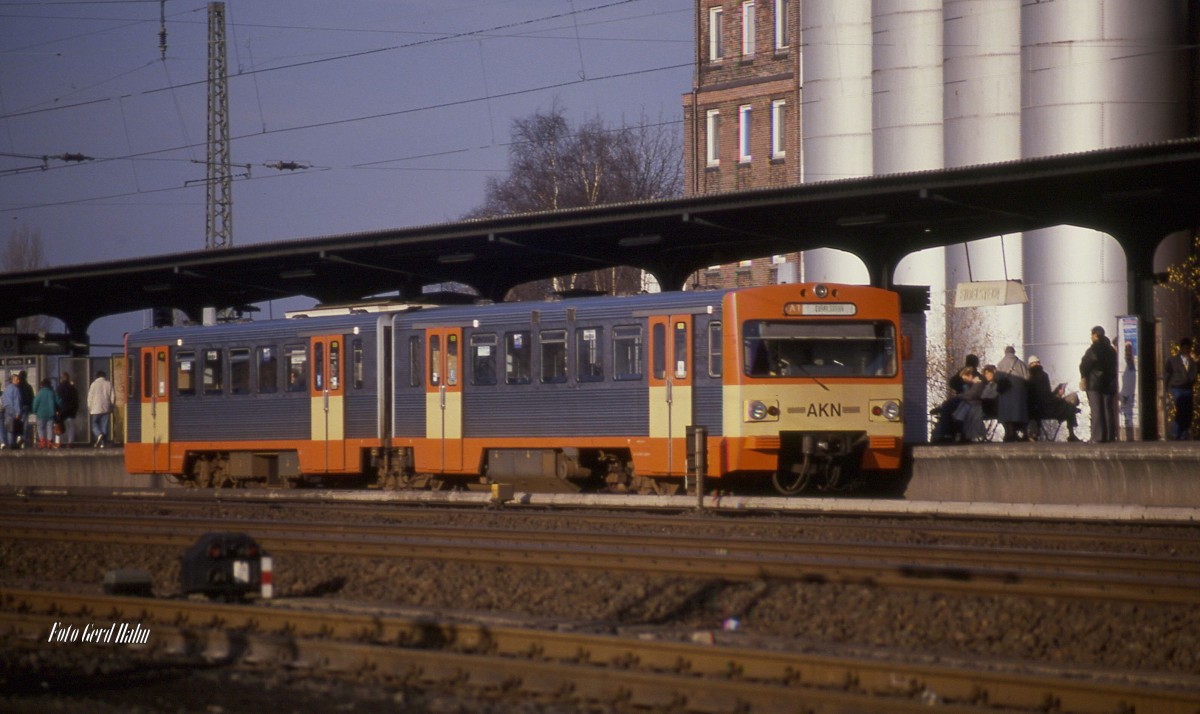 Zwei MAN Triebwagen der AKN im Endbahnhof Garstedt der Alsternordbahn. So ziemlich alles auf diesem Bild von 1988 ist inzwischen Geschichte. Unter dem Parkplatz links fährt jetzt die hamburger U-Bahn und ein Parkplatz ist es auch nicht mehr. Das Parkhaus rechts und die Gebäude vor dem Triebzug sind durch größere Neubauten ersetzt worden. Die Gleise sind verschwunden und die Fahrzeuge haben bei der Karsdorfer Eisenbahn ihr Ende gefunden. Ich hätte nie gedacht, das man solch eine triste, graue Bahnhofsanlage vermissen könnte, aber ich tue es. Bild und Scan Stephan Engel Stephan Engel