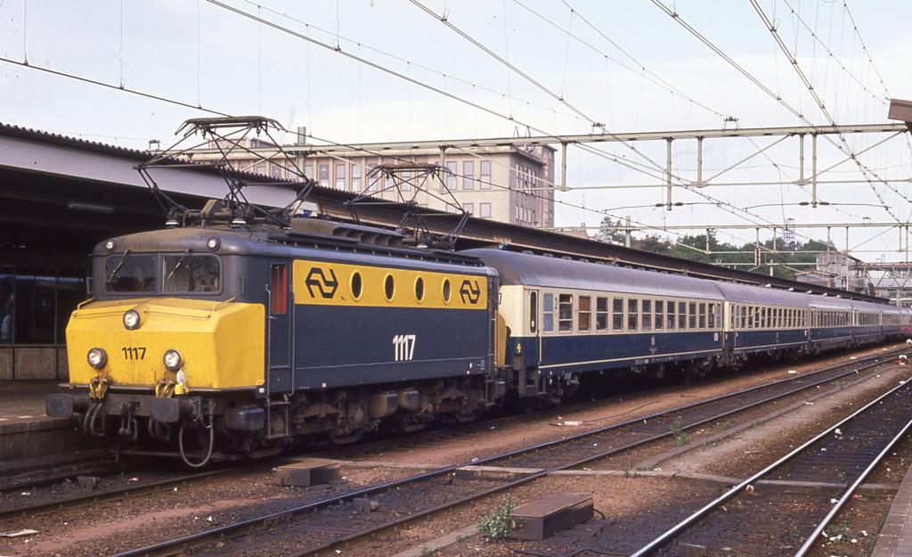 Altbau Elektrolok der NS 1117 hält am 15.7.1989 um 9.02 Uhr
