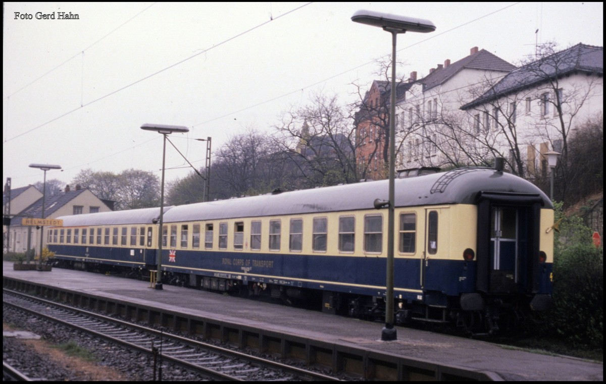 Begleitwagen des Royal Corps of Transport am 5.4.1989 im Bahnhof Helmstedt. Derartige Wagen wurden in den Interzonenzügen der Briten zwischen Westdeutschland und Berlin eingesetzt. Dieser Wagen trug die Bezeichnung: Bcmk 518009-40051-7 Gerd Hahn