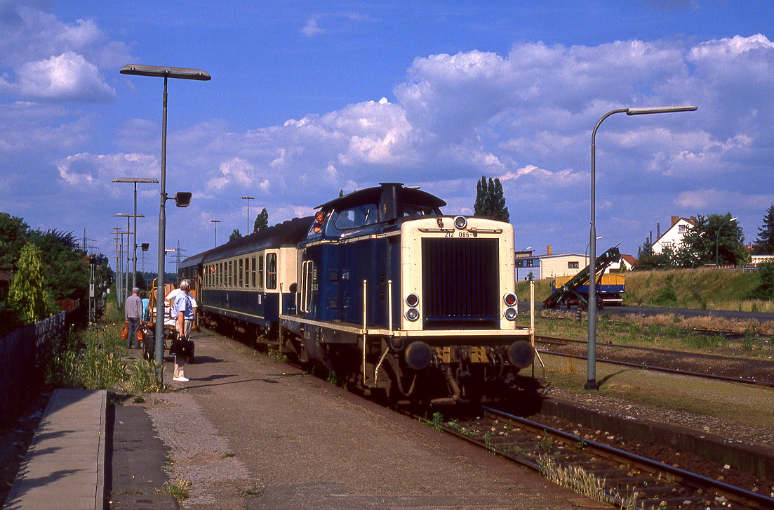 Als 212 071 in Bad Kissingen auf Gleis 3 stand, gab es dort noch fünf Gleise und die Güterabfertigung am rechten Bildrand. (Blick nach Norden etwa 1989) Jörg Schäfer