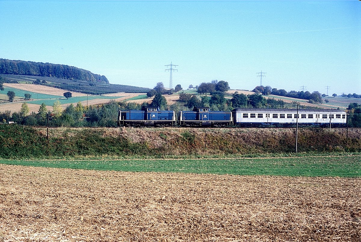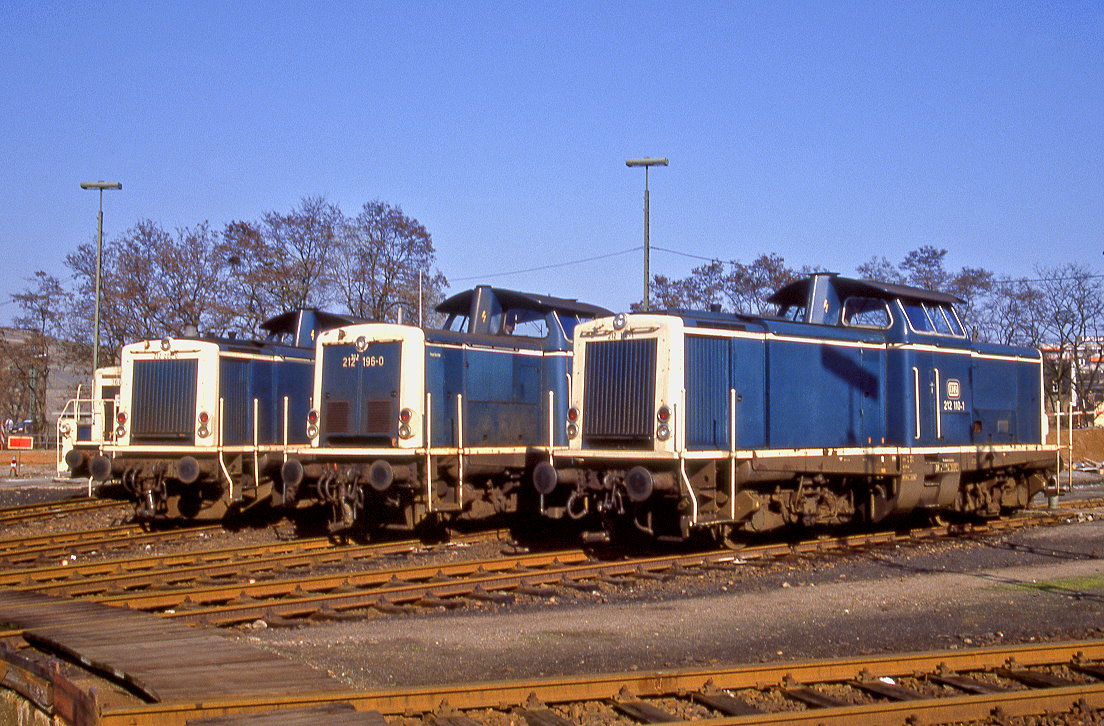 Nachdem die Eifelquerbahn aufgrund der momentan stattfindenden Überführungsfahrten wieder mal Gesprächsthema ist, möchte ich hier einige Aufnahmen aus besseren Zeiten zeigen: Eine unbekannte 212 ist hier an einem leider völlig verregneten Frühjahrstag 1989 mit einem Nahverkehrszug nach Gerolstein bei Hohenfels unterwegs Horst Lüdicke