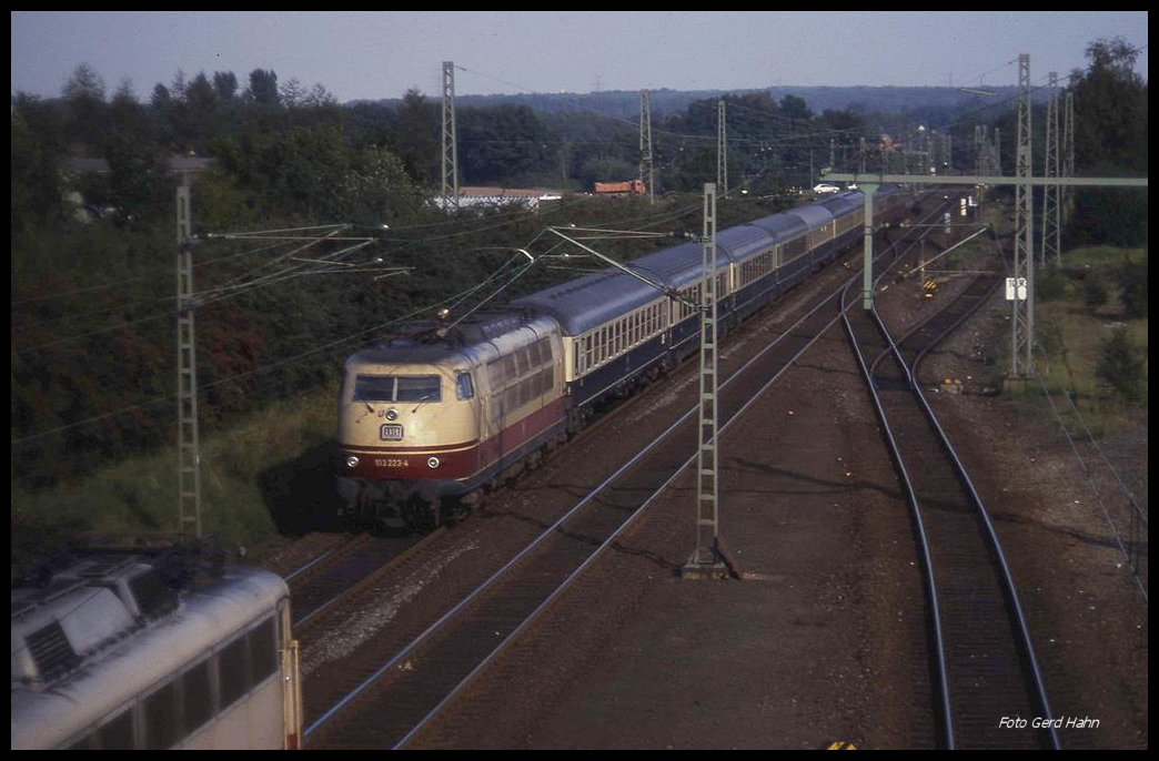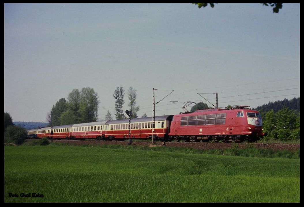 103185 ist hier am Ortsrand von Hasbergen am 20.09.1989 mit IC 630 "Theodor Storm" um 15.52 Uhr auf der Rollbahn in Richtung Münster unterwegs. Gerd Hahn