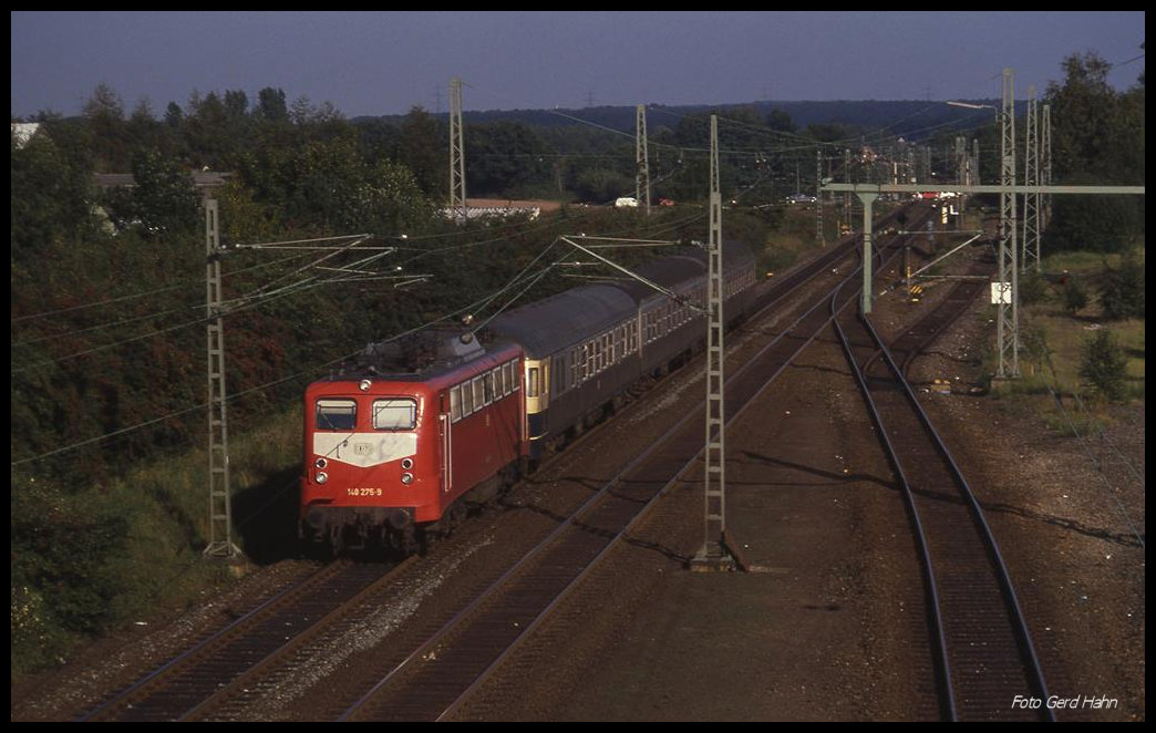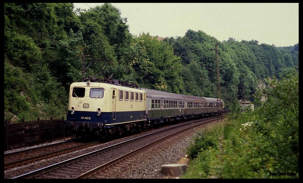 Ein grüner Knallfrosch in Form der 141285 war mit einer Garnitur Silberlinge, dem N 8614, am 18.5.1989 um 11.50 Uhr am Ortsrand von Hasbergen auf der Rollbahn nach Münster unterwegs. Gerd Hahn
