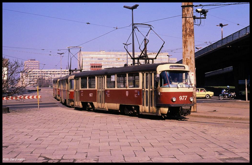 Tram Wagen 977 Tatra auf der Linie 12 am HBF Halle am 18.3.1990.