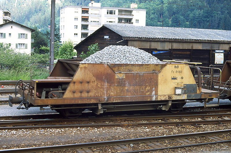 RhB - Fd 8660 am 28.05.1990 in Thusis - Schotterwagen 2-achsig mit 1 offenen Plattform - Baujahr 1965 - Talbot - Gewicht 7,35t - Zuladung 15,00t - LüP 7,99m - zulässige Geschwindigkeit 55 km/h - ®2=10.11.1987 - Lebenslauf: Fd 8660 - 02/2004 Xc 9420