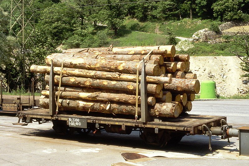 RhB - Kkp 7350 am 30.05.1990 in Campocologno - Kipfenwagen 2-achsig mit 1 offenen Plattform - Baujahr 1913 - Rast - Gewicht 5,33t - Zuladung 12,50t - LüP 7,79m - zulässige Geschwindigkeit 60/B km/h - Lebenslauf: ex M1 7350 - 1969 Kk 7350 - 1989 Kkp 7350 - 03/2006 Abbruch!