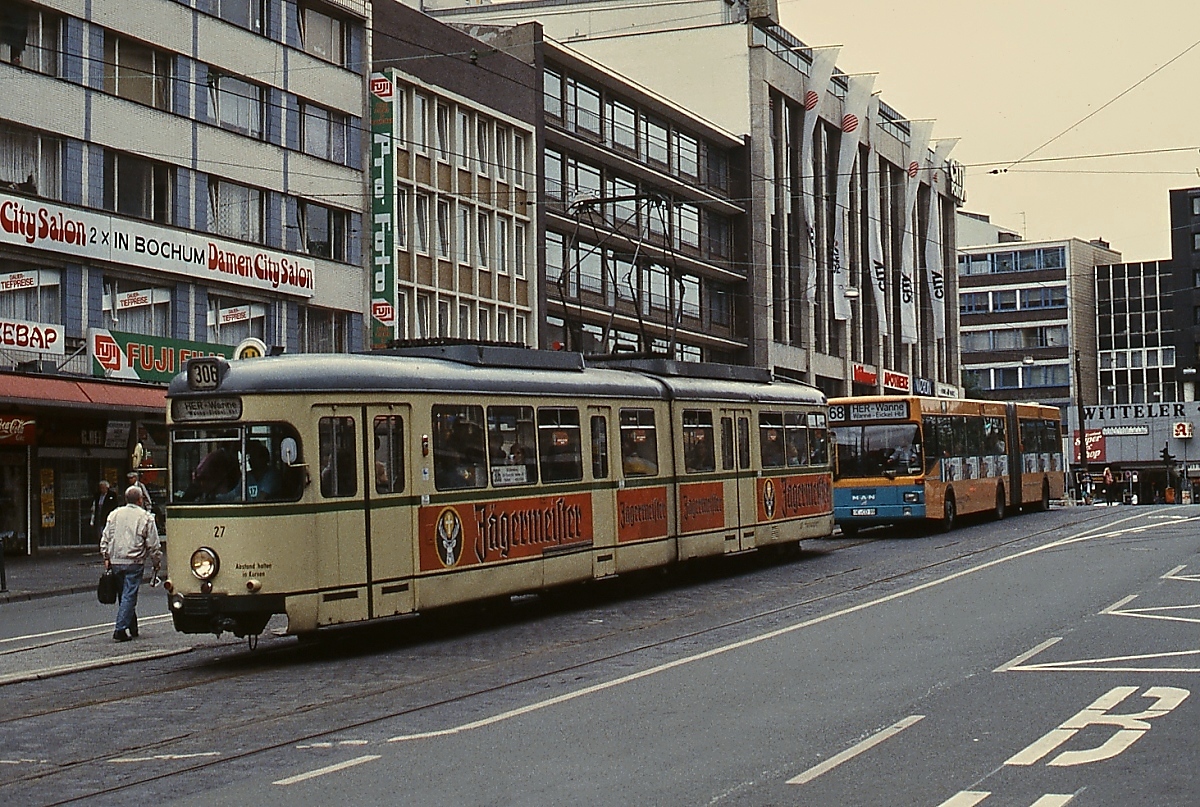 Mehrere Wege führen von Bochum nach Wanne-Eickel: Vorne der Bogestra-GT6ZR 27, dahinter ein Gelenkbus an der Haltestelle Hans-Böckler-Straße um 1990 Horst Lüdicke