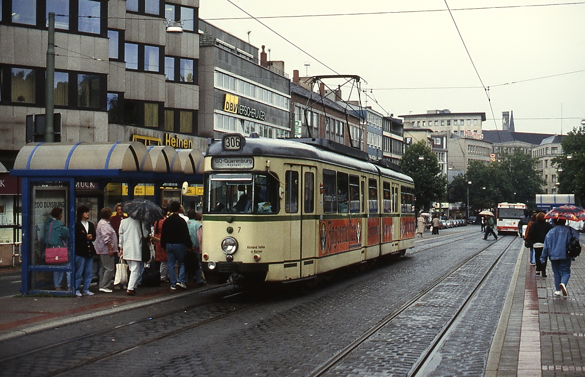 Bei strömendem Regen überquert der GT6ZR 27 um 1990 auf seinem Weg nach Bochum-Querenburg die Oskar-Hoffmann-Straße. Nach der Eröffnung des U-Bahn-Tunnels sieht es hier ganz anders aus. Horst Lüdicke