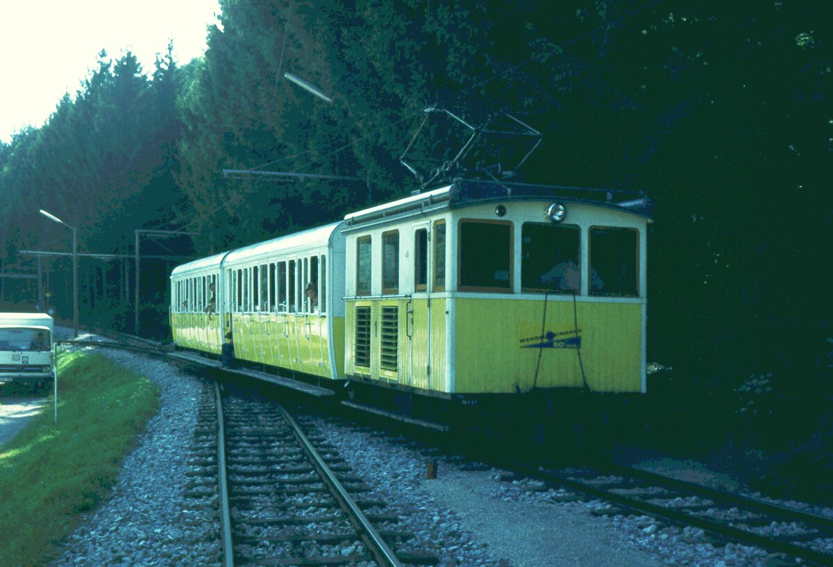 Ausfahrt aus dem Talbhf. Waching_16-08-1973__Drei elektrische Zahnradlokomotiven wurden 1912 bei der Maschinenfabrik Esslingen und Brown, Boveri beschafft, die passenden Vorstellwagen in Abteilbauweise mit jeweils 50 Sitzplätzen lieferte die MAN in Nürnberg. 1935 wurde noch eine vierte Lokomotive nachgeliefert, so dass bis 1990 vier Garnituren im Einsatz standen. Klaus-Erich Lisk