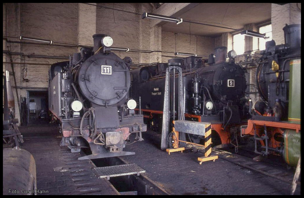 Zu einer Führung am 22.6.1991 in Klostermansfeld gehörte auch dieser Blick in die Werkstatt der Mansfelder Bergwerksbahn, in der gerade Lok 9, 11 und zum Teil sichtbar Lok 10 versammelt waren. Gerd Hahn