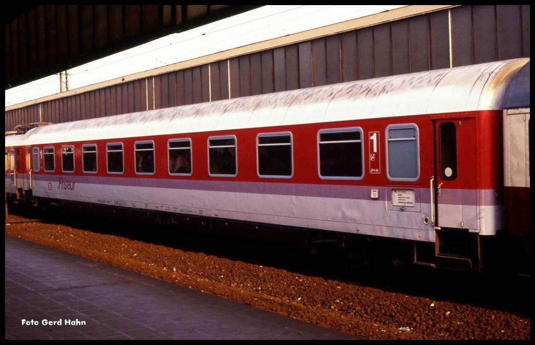 Friseurwagen AvmZ 618084-95031-9 am 11.5.1991 im Intercity Hanseat 635 im Hauptbahnhof Essen.