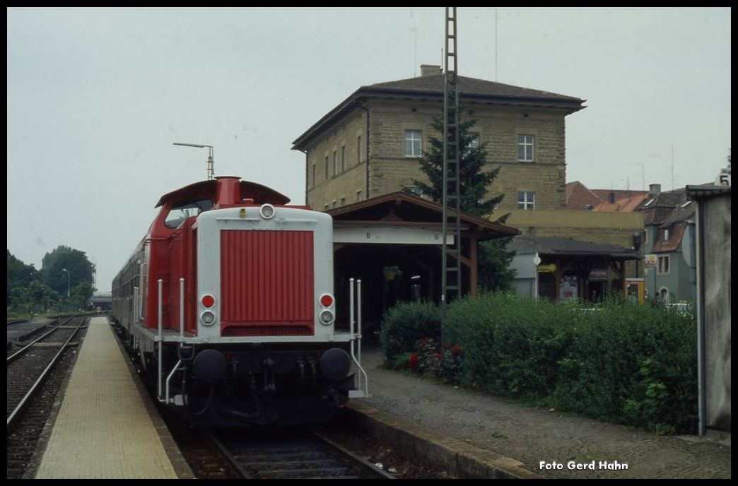Eine 1991 typische Wendezuugarnitur vor Burgbernheim mit seinem Hausberg. Auf der im Hintergrund sichtbaren Frankenhöhe liegt der Haltepunkt "Burgbernheim Wildbad" der Hauptstrecke Würzburg-Ansbach. Jörg Schäfer