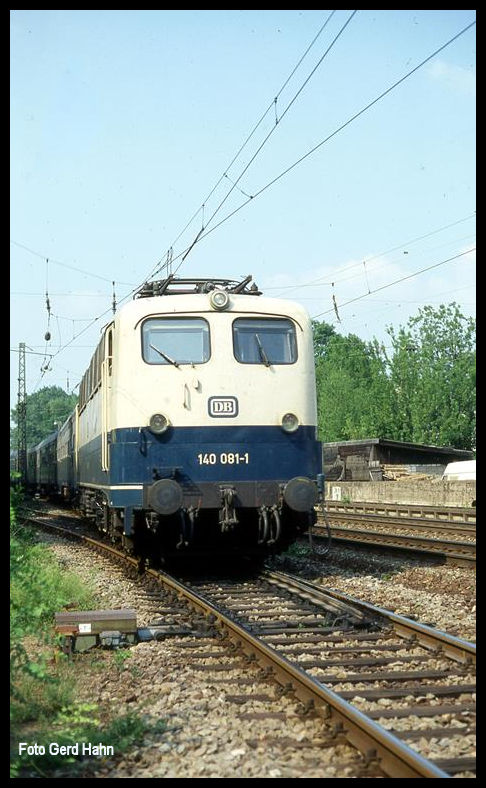 140119 fährt hier am 5.7.1991 um 16.41 Uhr mit einem Güterzug in Richtung Stuttgart in Wiesloch Walldorf aus.