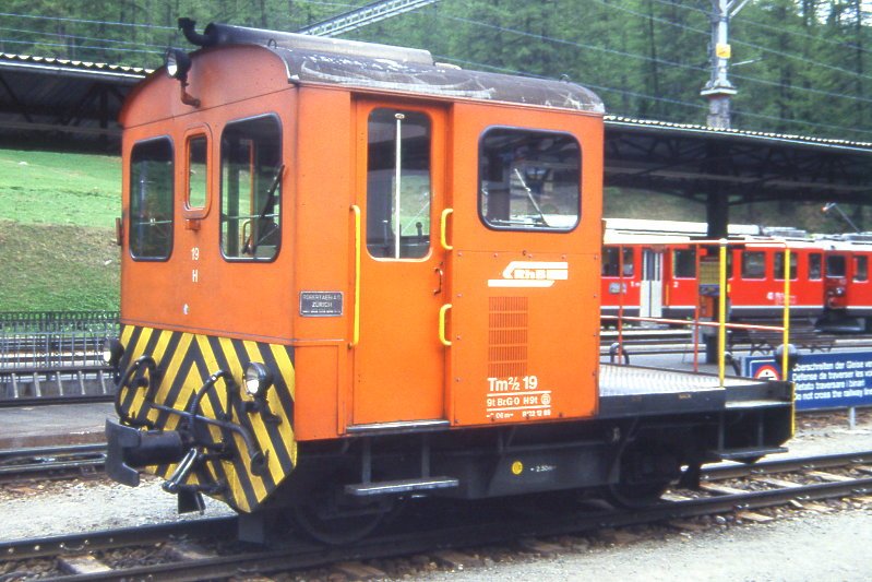 RhB - Tm 2/2 19 am 31.05.1992 in Pontresina - Rangiertraktor - Übernahme: 19.05.1962 - RACO1631/CUMMINS - 69 KW - Gewicht 9,00t - Zuladung 2,00t - LüP 5,06m - zulässige Geschwindigkeit 4/8/17/30/60geschleppt km/h - ®3=22.12.1989 - Logo nur RhB - Heimatstation: Tirano - Lebenslauf: ex Tm 2/2 62 - 12/1989 Tm 2/2 19. Hinweis: gescanntes Dia