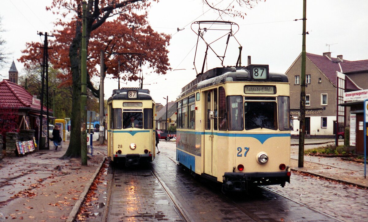 Woltersdorfer Straßenbahn__Haltestelle 'Thälmann-Platz' im Woltersdorfer Ortszentrum. Treffpunkt der Tw 28 und 27 von bzw. nach 'Woltersdorf Schleuse'.__29-10-1992 Klaus-Erich Lisk