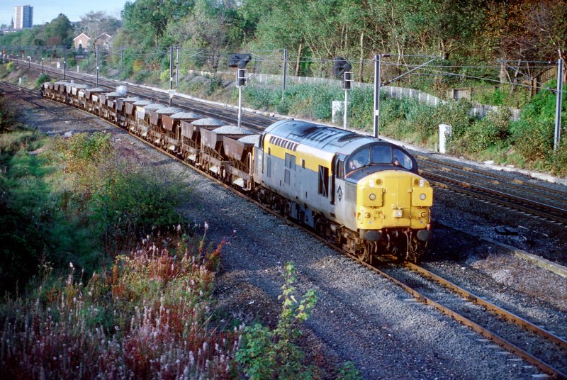Am 19. October 1992 zieht 37095 einen Schotterzug bei Low Fell in der Naehe von Newcastle-upon-Tyne, Nordost England.