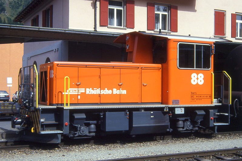 RhB - Tmf 2/2 88 am 30.08.1993 in Pontresina - Stärkerer Dieselmotor-Stationstraktor - Übernahme: 27.06.1992 - RACO1989/Cummins - 331KW - Gewicht 24,00t - LüP 7,50m - zulässige Geschwindigkeit 16/32/50/60geschleppt km/h - Logo RhB deutsch - Heimatstation: Pontresina - Hinweis: gescanntes Dia