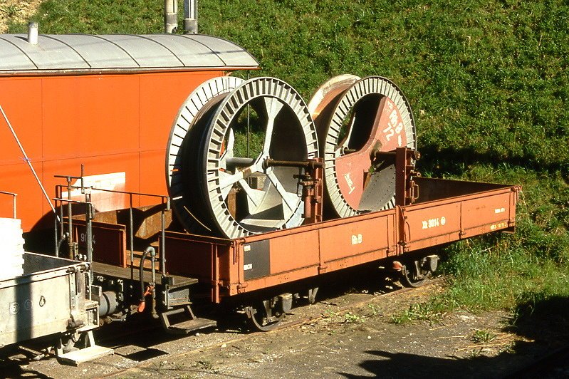 RhB - Xk 9014 I am 17.07.1989 in Brusio - Bobinenwagen - 2-achsig mit 1 offenen Plattform - Baujahr 1897 - Louv - Gewicht 5,50t - Ladegewicht 10,00t - LüP 7,49m - zulässige Geschwindigkeit 55 km/h - ®=24.10.1978 - Lebenslauf: ex M 243 - 1899 M 1143 - 1911 M 7013 - 1924 X 9014 I - 1989 Xk 9014 I - 1994 Abbruch