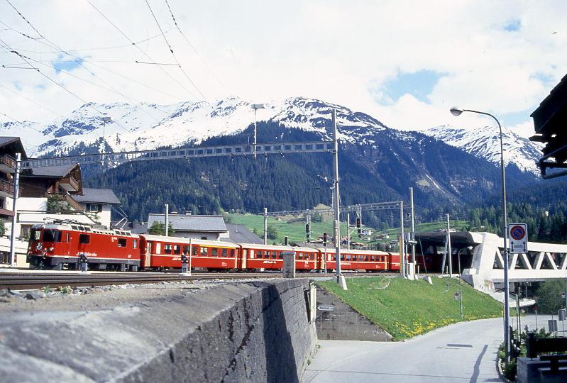 RhB Regionalzug 68 von Davos-Platz nach Landquart vom 13.05.1994 Einfahrt Klosters mit E-Lok Ge 4/4II 617 - AB 1529 - B 2370 - B 2361 - D 4205 - Z 94. Hinweis: Weitwinkelaufnahme, rechts ist ein Teil der neuen globig aussehenden Landquart-Brücke zu sehen. Manfred Möldner